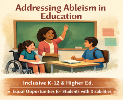 Addressing Ableism in Education (Higher Education & K–12) focuses on the redesign of educational environments that move beyond compliance toward equity, belonging, and academic success. The Center develops strategies to create and sustain inclusive educational environments and addresses disparities in educational outcomes for students with disabilities.